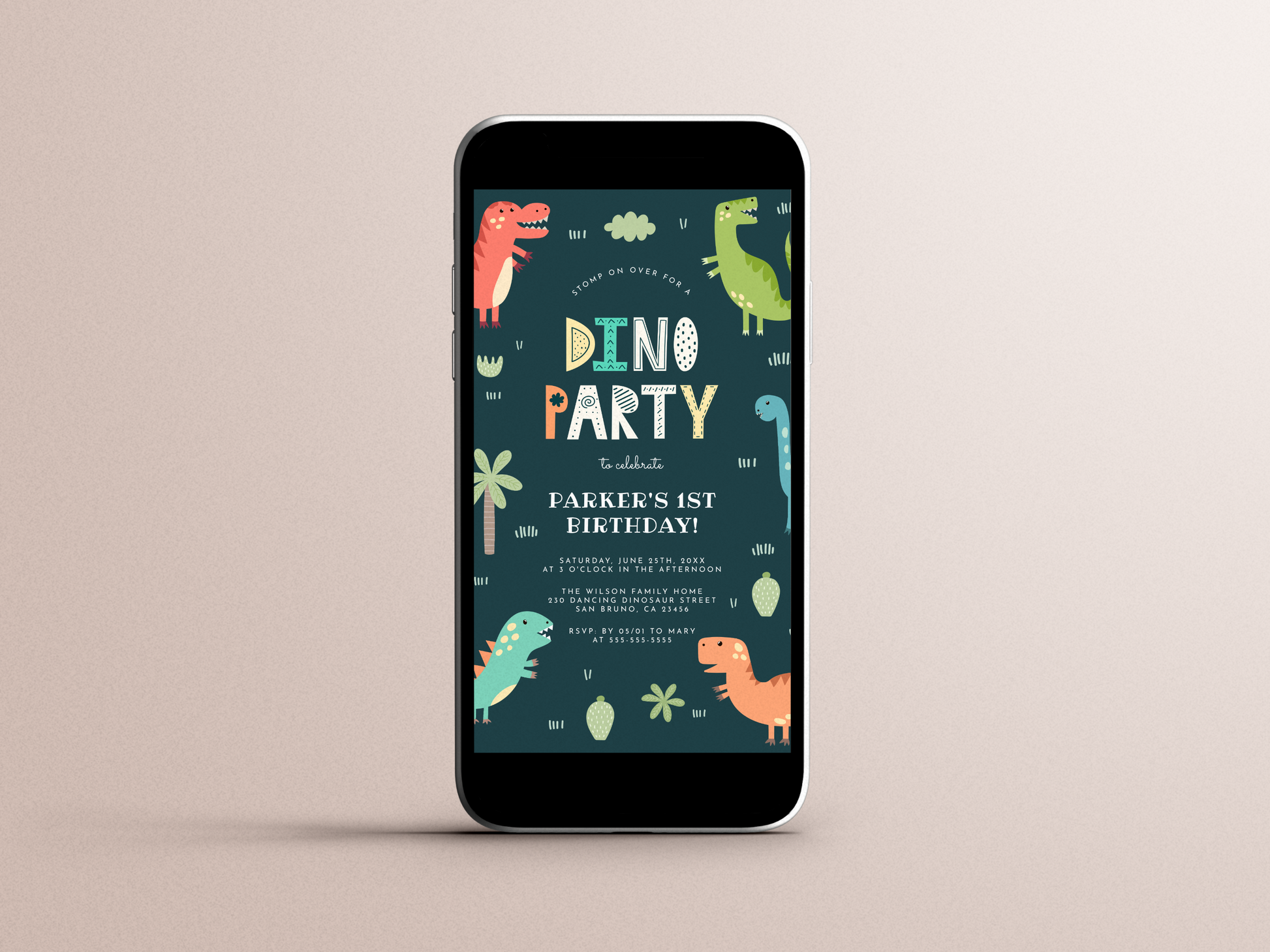 It's a dino party! This cute dinosaur-themed birthday party invitation is perfect for little boys of any age! Simply personalize with your son's name, age, and party details to create your own custom invites! The frame is made up of 5 different colored dinosaurs, with cactus plants, a palm tree, and green grass against a dark blue background. The words "dino party" are made up of fun illustrated letters to match the animals!