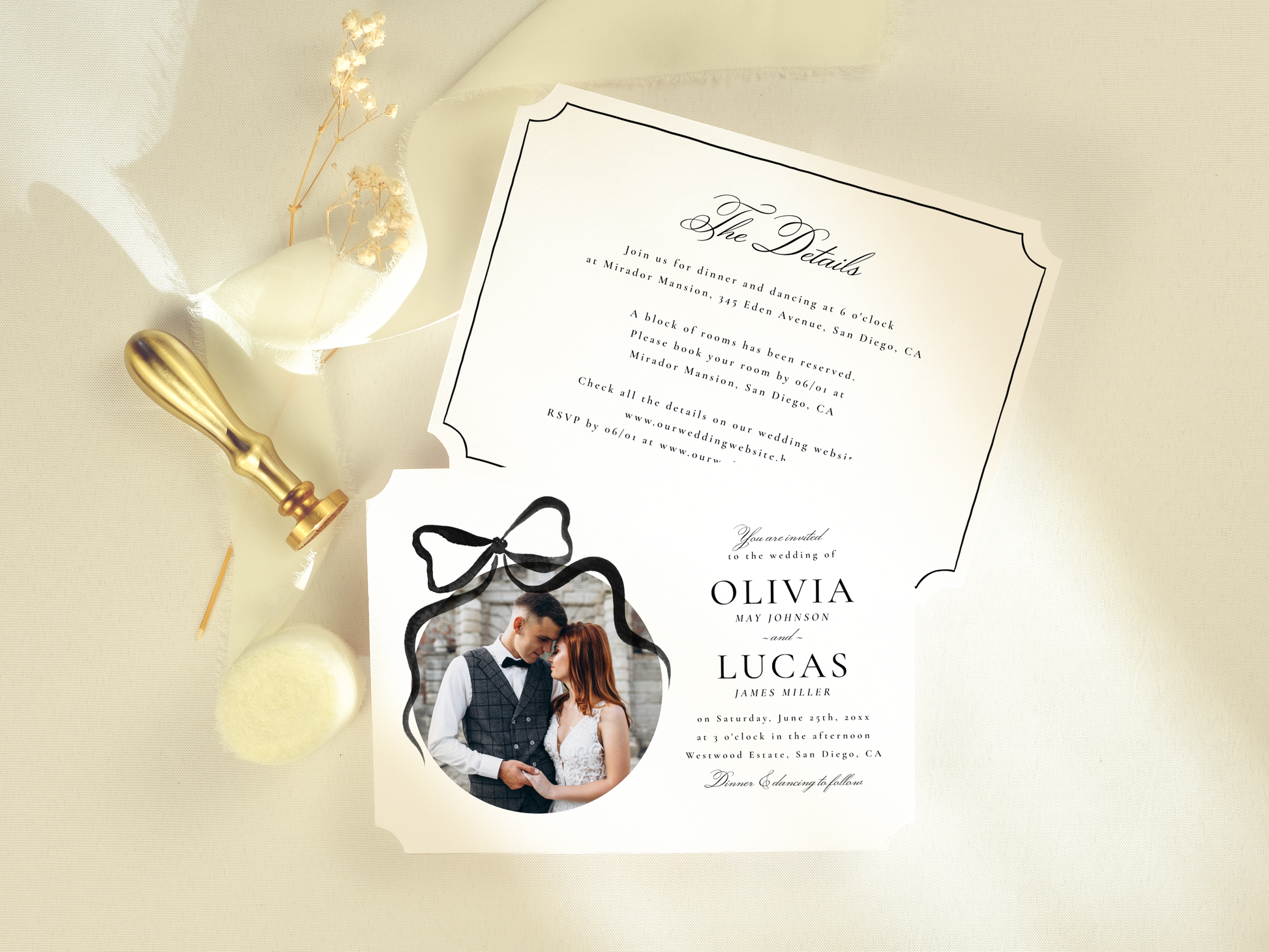 Elegant black and white wedding invitations. Featuring a hand-painted watercolor bow framing a circular couple’s photo on the left, paired with timeless serif typography and script lettering on the right. The back showcases a ticket-style frame with the event details. Ideal for black tie or formal events.