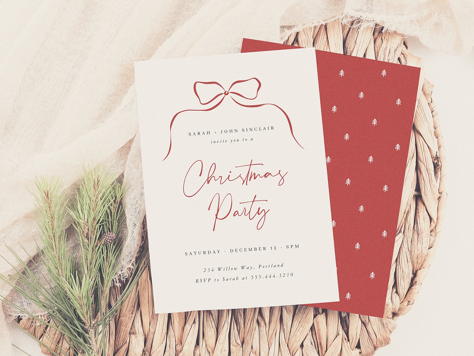 Invite friends and family to celebrate with this festive Christmas party invitation. The design features a hand-drawn red bow with ‘Christmas Party’ in matching script lettering. Easily edit the wording for a White Elephant, Secret Santa, cocktail party, dinner party, or any holiday-themed celebration. The back showcases a minimal Christmas tree pattern on a classic red background.