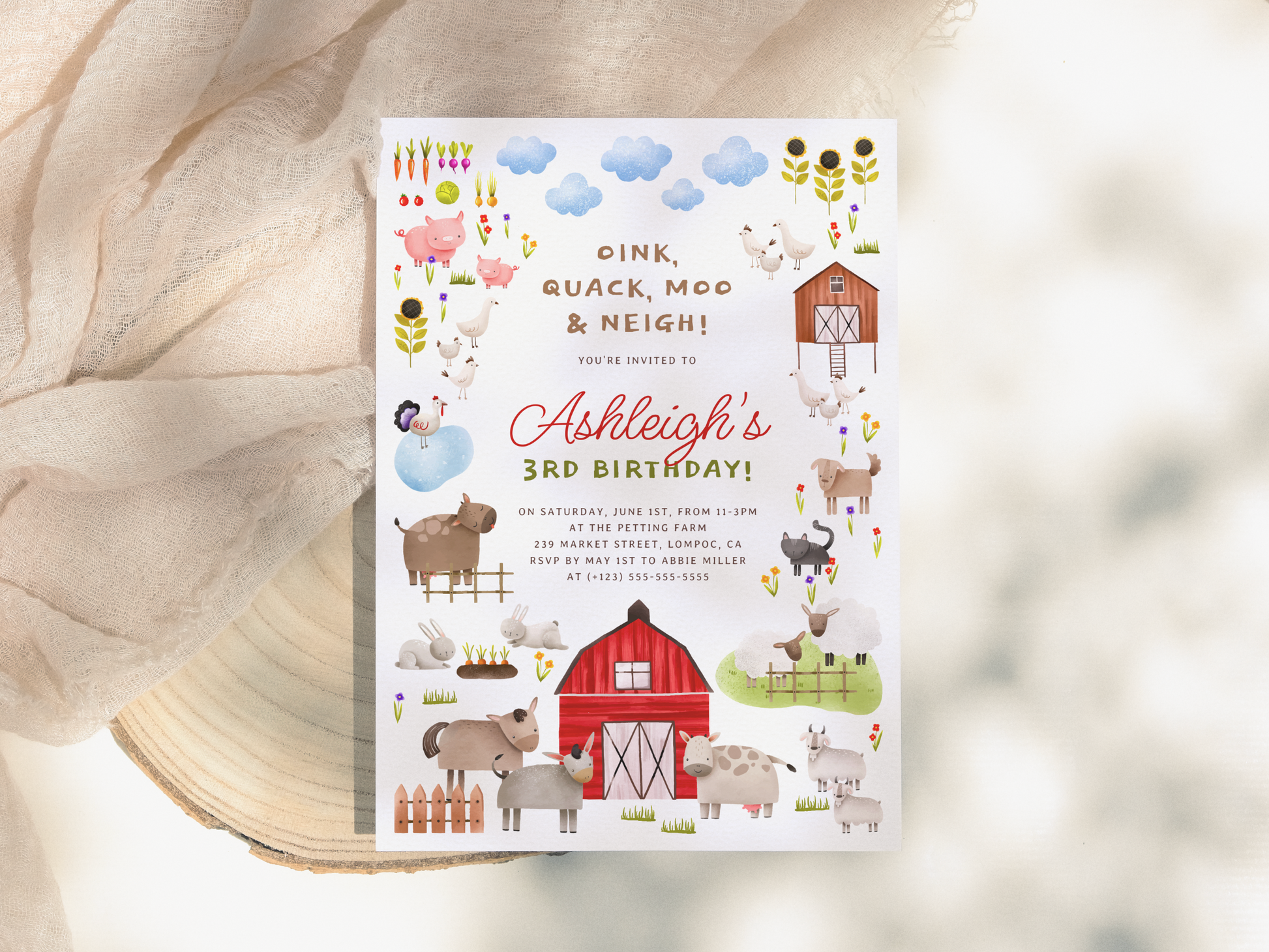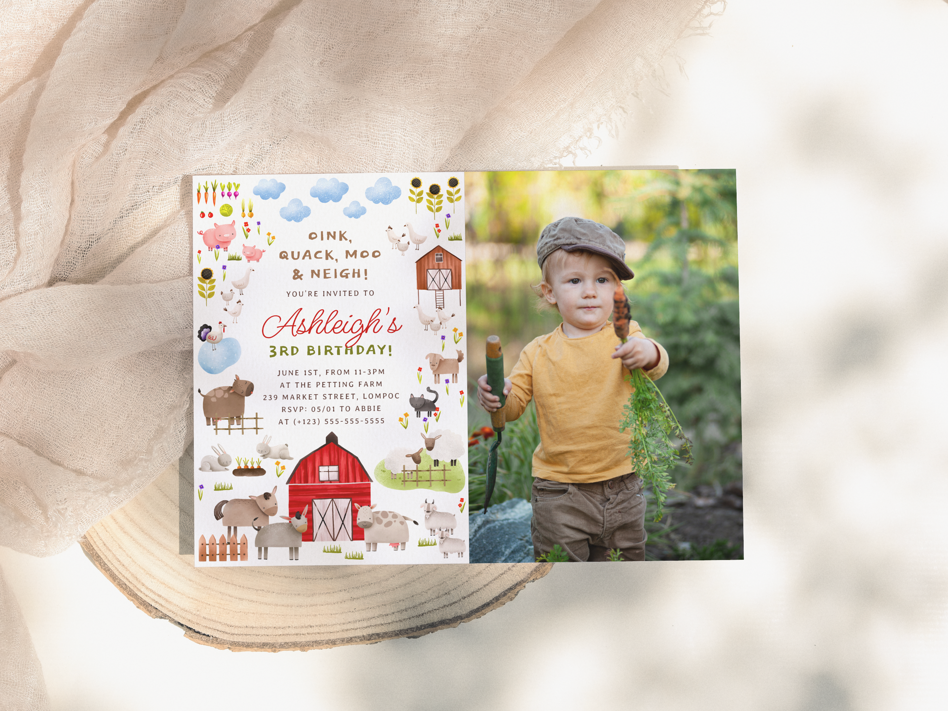 Celebrate your little farmer's big day with this birthday party invitation! This birthday party invitation features a frame full of charming farm animal illustrations. There are two little pigs, a family of ducks, cows, bunny rabbits, a horse and a donkey, goats, some sheep, a cat and a dog, a house full of chickens, and a big red barn. Inside the frame, it reads "Oink, quack, moo & neigh" and an invite to the birthday. The birthday boy or birthday girl's name is written in red script lettering with their age below in green capitals. This any-age birthday party invite is perfect for trips to the petting zoo, celebrations at a local farm, and barnyard-themed parties. A gender-neutral design, perfect for any boy or girl. Photo and non-photo versions to choose from.