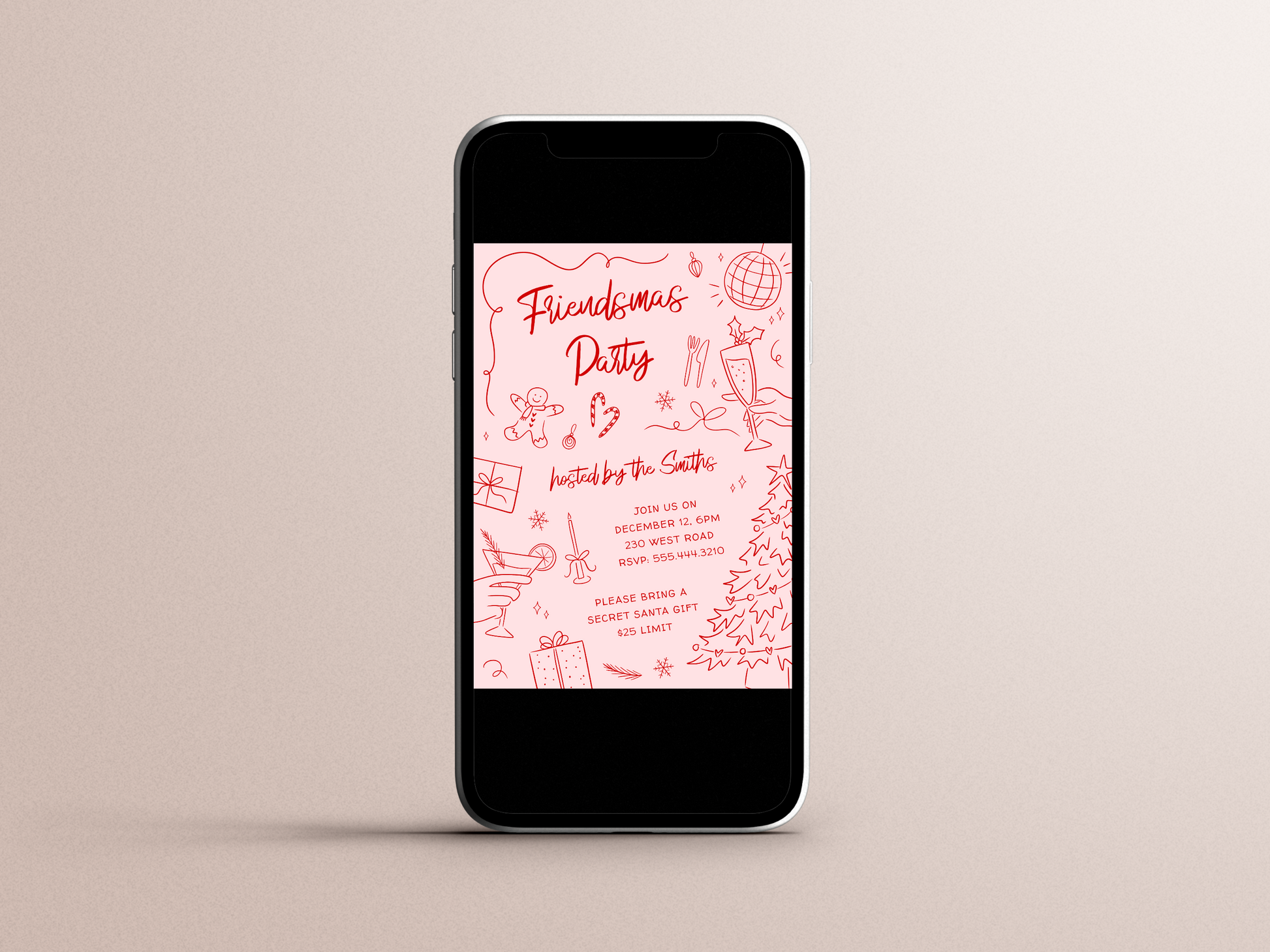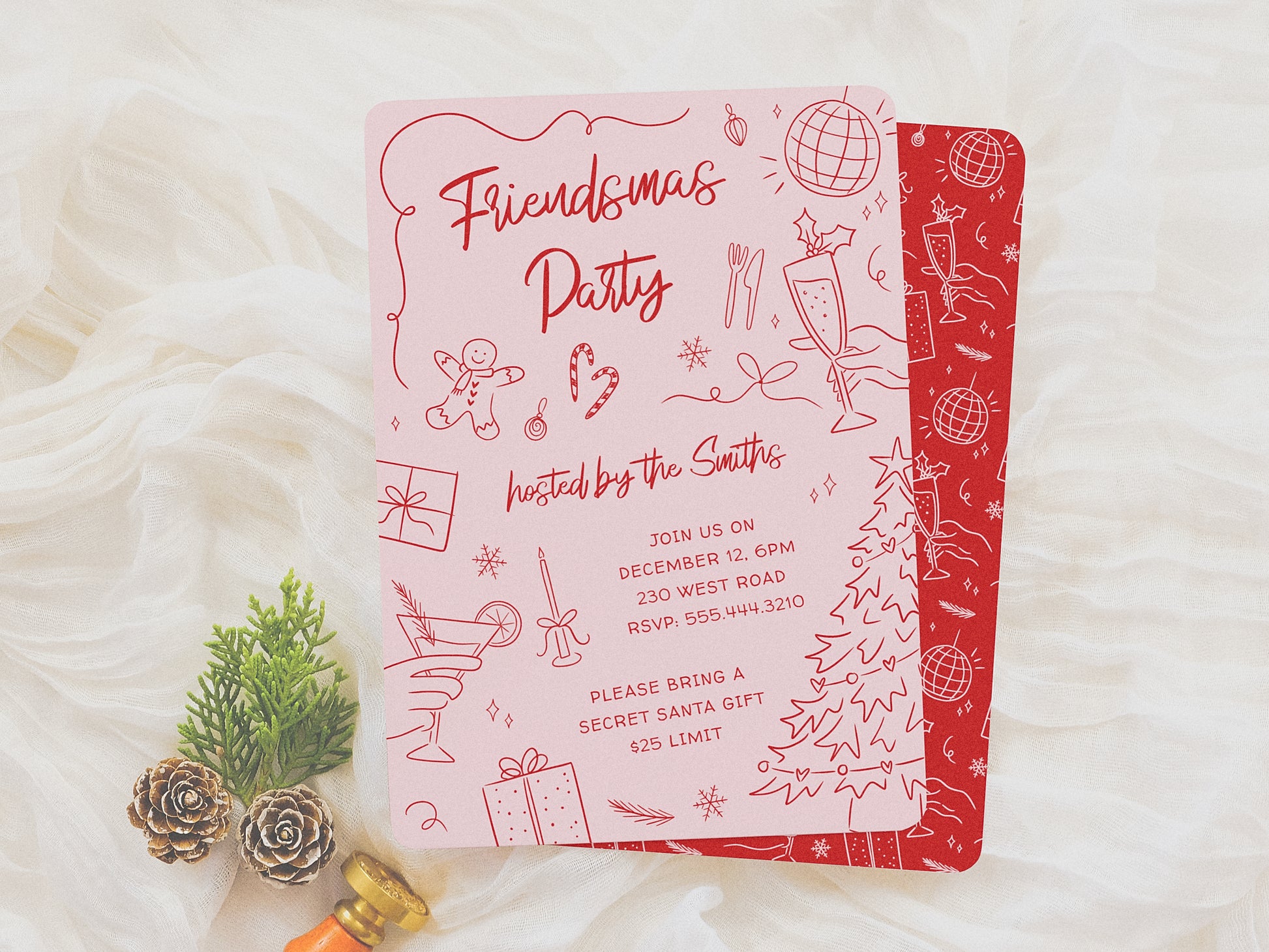 Invite friends and family to a Friendsmas celebration with this whimsical Christmas invitation! Featuring a modern, bold red and pink color scheme, the design showcases holiday cocktails, a Christmas tree, disco ball, ornaments, bows, candles, gifts, snowflakes, and sparkles in a hand-drawn, doodle style. Editable wording makes it perfect for Secret Santa, White Elephant, cookie swaps, dinner parties, or any holiday gathering. Cards reverse to a matching festive scribble pattern.Â