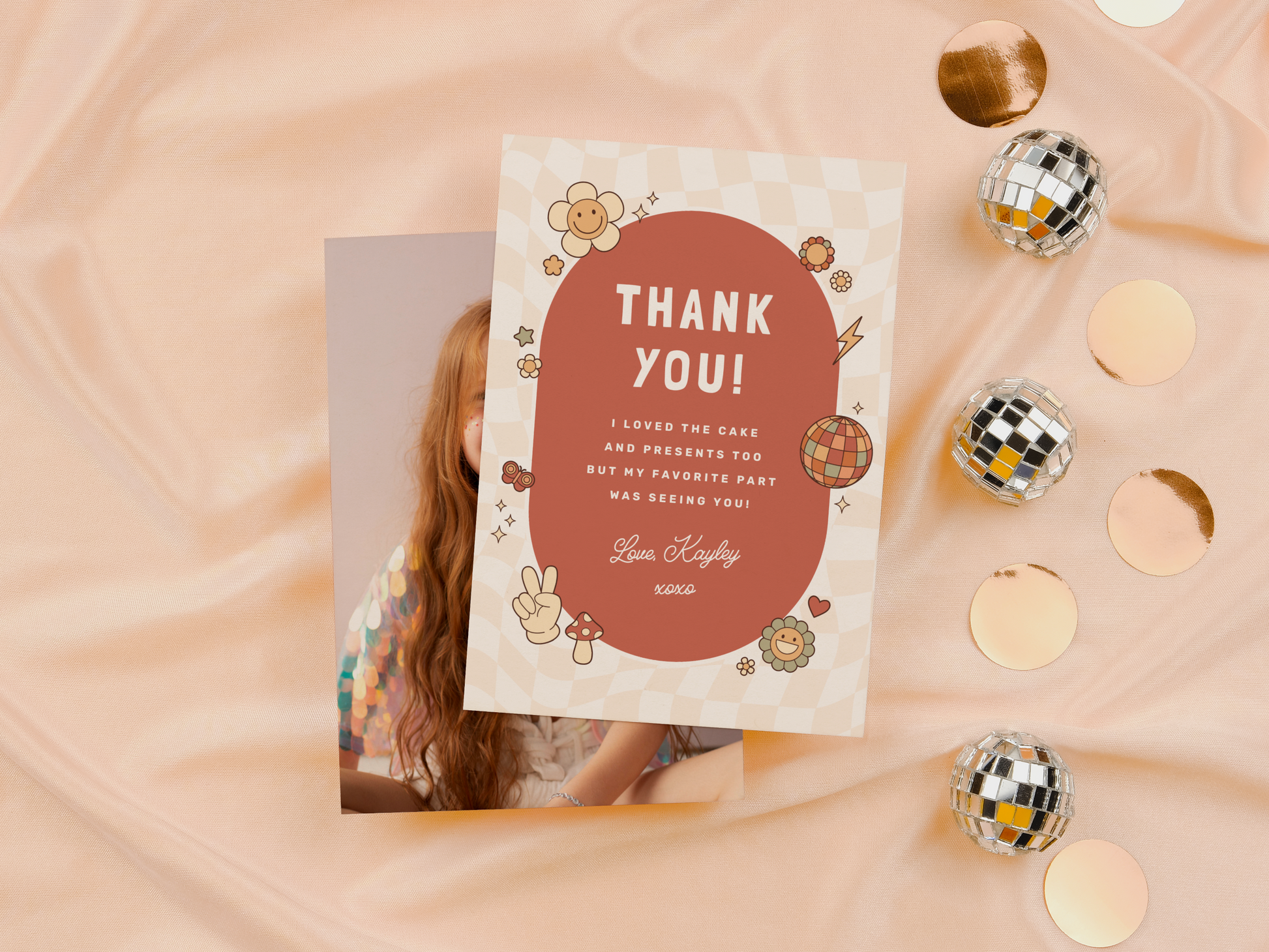 Celebrate in style with this boho girl birthday invitation suite! This fun design features a mix of funky sticker-shaped sections for all your party details. Decorated with groovy elements like a smiley daisy flower, stars, sparkles, a butterfly, a peace sign, a disco ball, a lightning bolt, and a mushroom against a wavy checkered background. The reverse side has a matching flower and sparkle pattern. Perfect for themes like Two Groovy/Two Cool, Five's a Vibe, Let’s Disco, Let’s Roll for rollerblade parties, hippie daisy themes, or any retro-inspired bash. Photo and non-photo versions to choose from.
