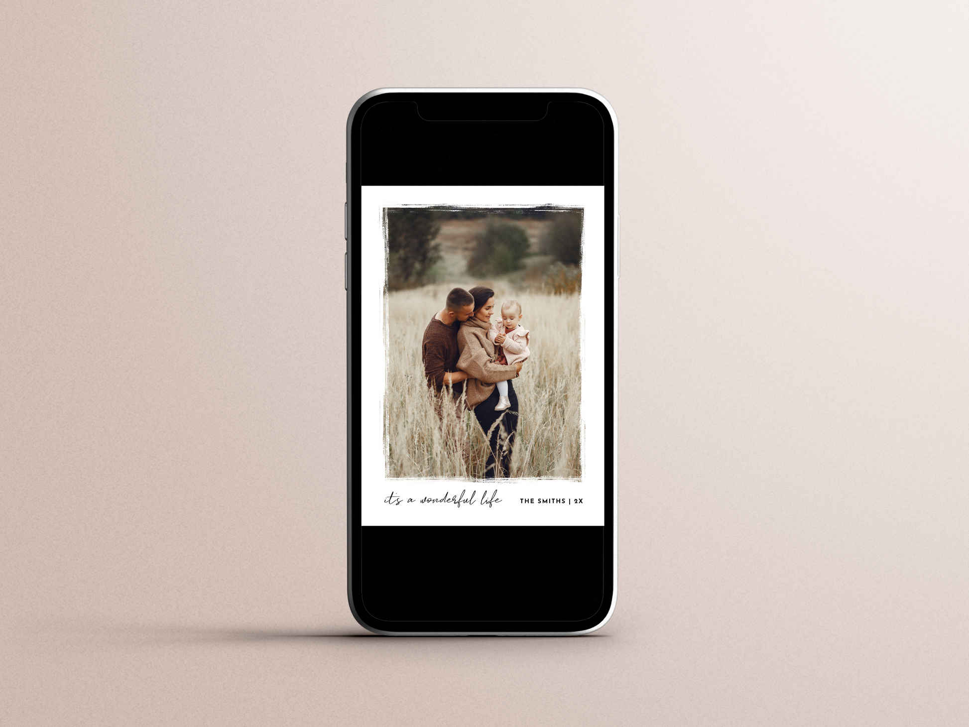 Capture the magic of the season with this elegant Christmas photo card design. Your portrait photo is framed by a hand-painted white border with rough, artistic edges, giving it a unique, handcrafted look. Below the photo, “It’s a Wonderful Life” is written in chic script lettering, with your family name and the year in bold serif typography. The design for the back of the card features a festive green plaid pattern, adding a touch of warmth to the simple, minimalist design.