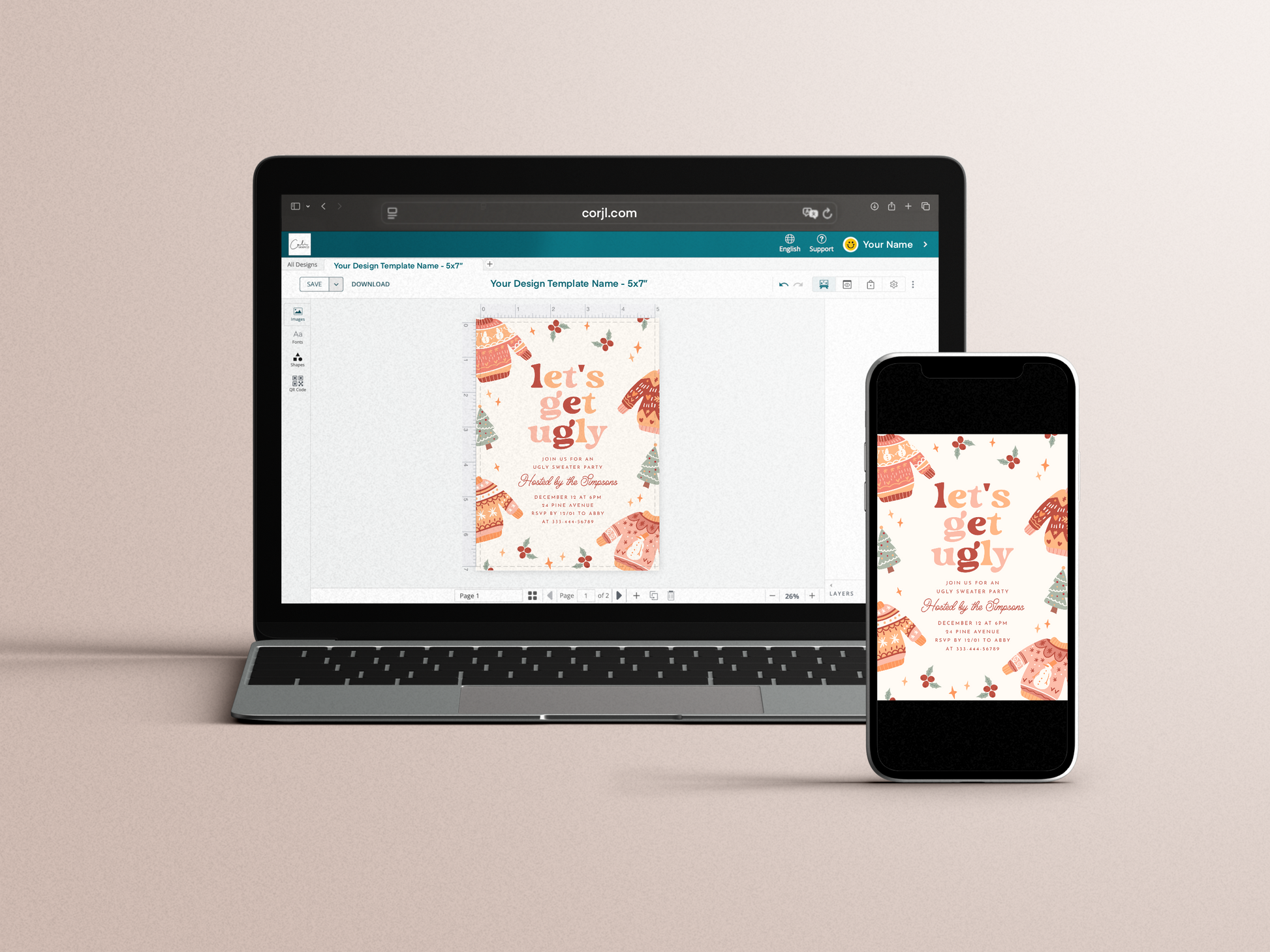 Let’s get ugly! Invite friends and family to your Christmas ugly sweater party with this fun retro design. The front features colorful sweaters, Christmas trees, holly, and stars around the border, with ‘Let’s Get Ugly’ in bold retro typography. Cards reverse to a groovy wavey pattern. The color scheme is a warm palette of red, pink, yellow, and cream with a pop of green.
