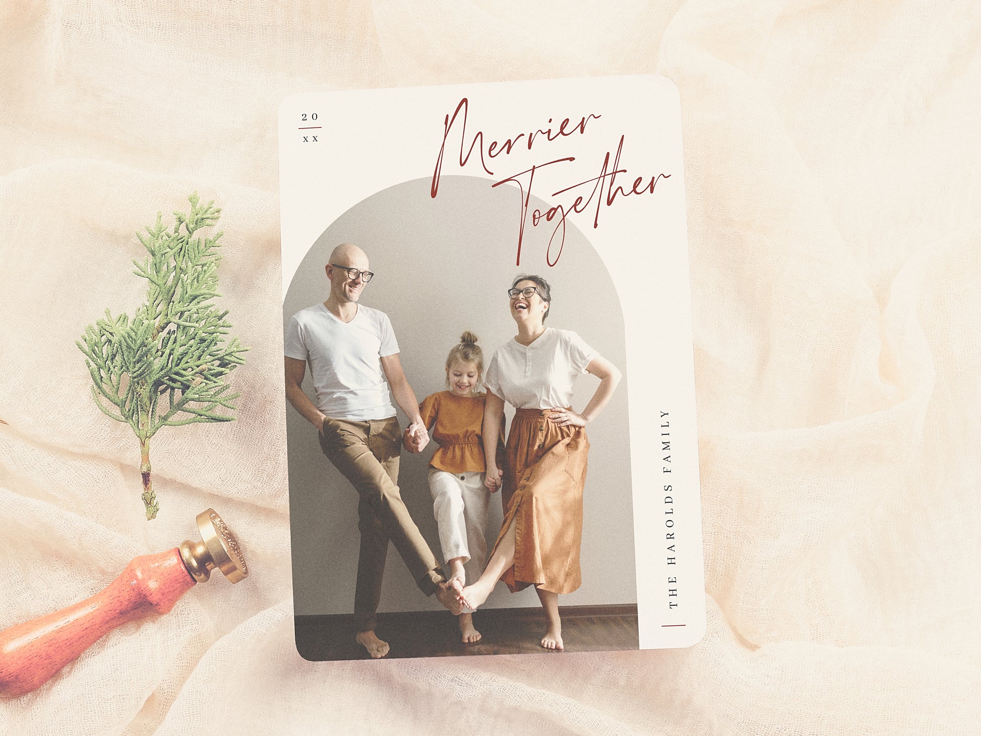 Merrier Together Christmas photo cards. The holidays are all about being together, and this card as a sweet way to share that feeling. This modern Christmas design features an arch shaped photo and "Merrier Together" in handwriting-style script lettering. Your family name appears along the right edge, and the year is printed over two lines in the top left-hand corner. Cards reverse to a second rectangular photo with space for a custom message, perfect for sharing a yearly recap or heartfelt holiday wishes with friends and family.