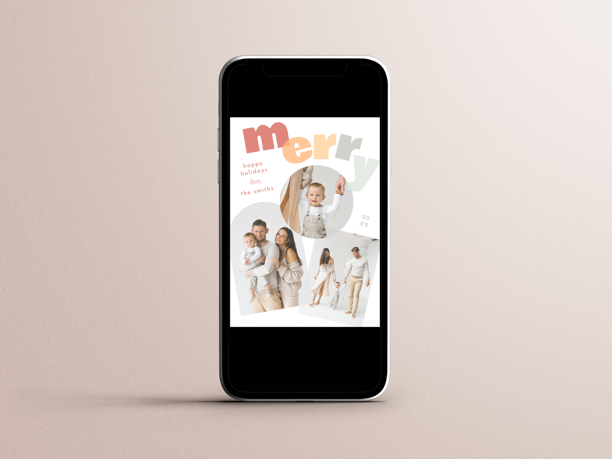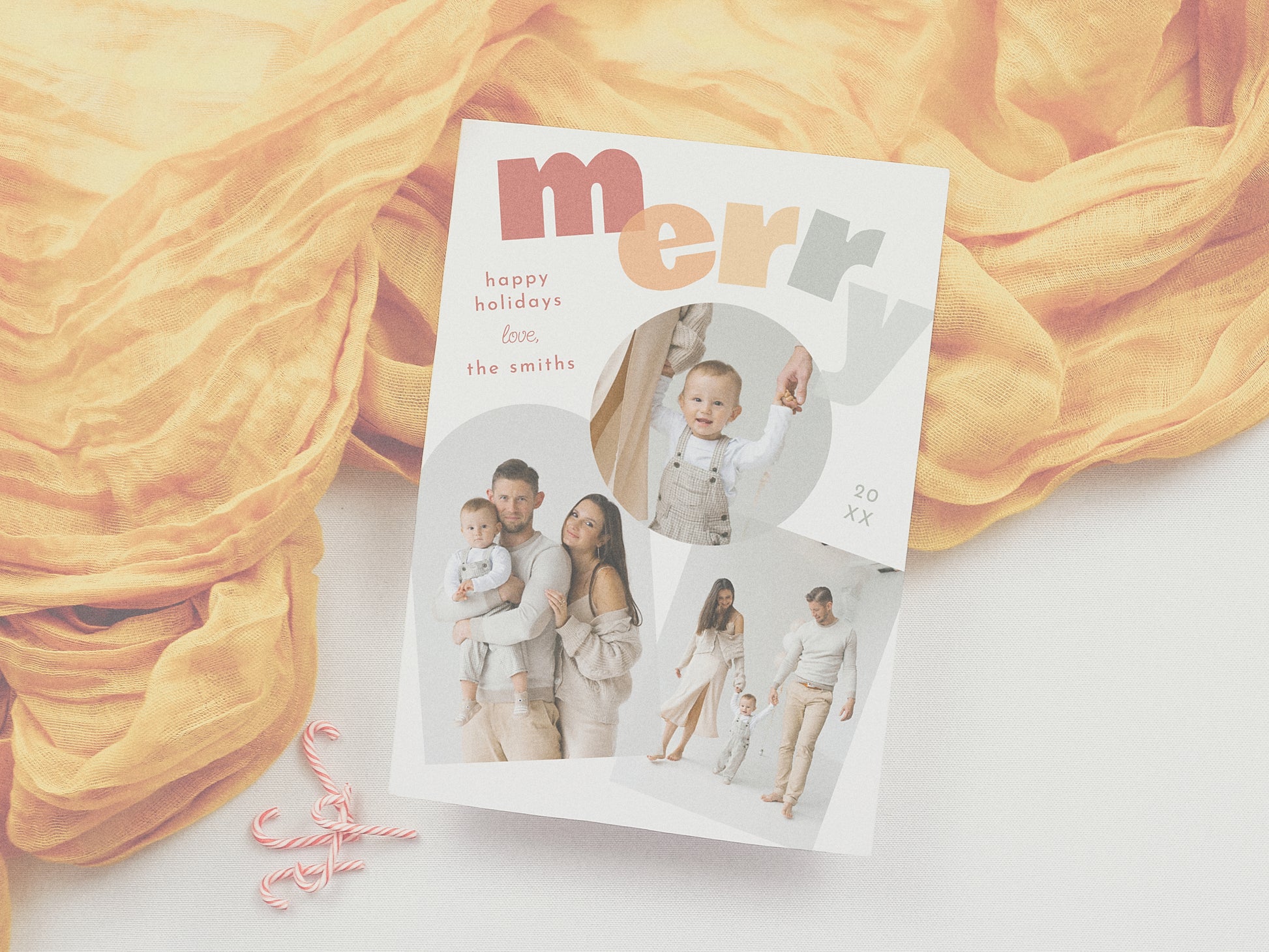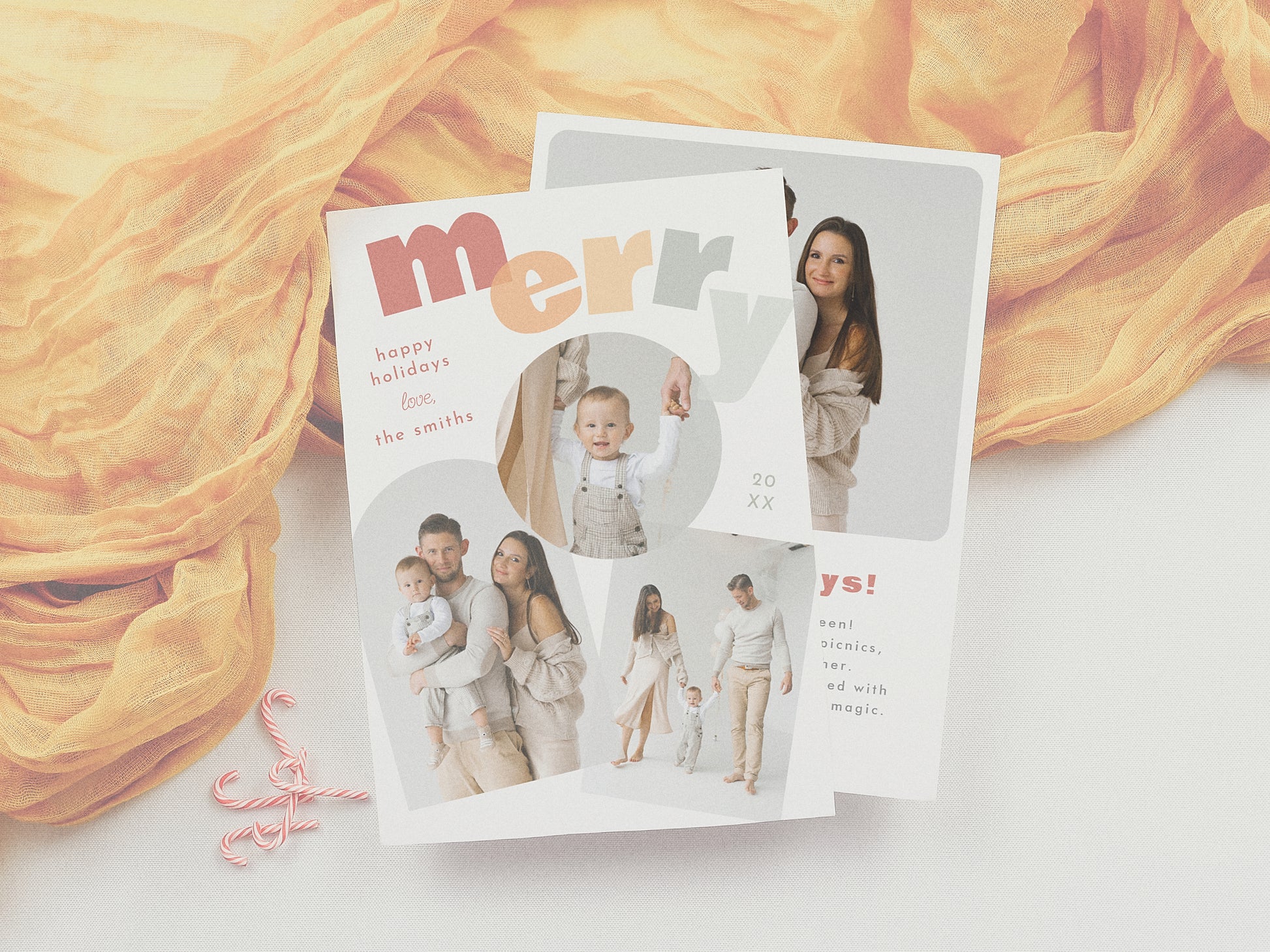 Modern Christmas holiday photo cards featuring the word ‘Merry’ in bold, overlapping typography for a fun, playful look. The front includes three custom photos, an arch, a circle, and a rectangle, along with a colorful greeting, family name, and year displayed between the images. The back of the card features a fourth photo, a personalized greeting, and space for a custom message. Great for families looking for a modern, bright, and colorful holiday photo card.