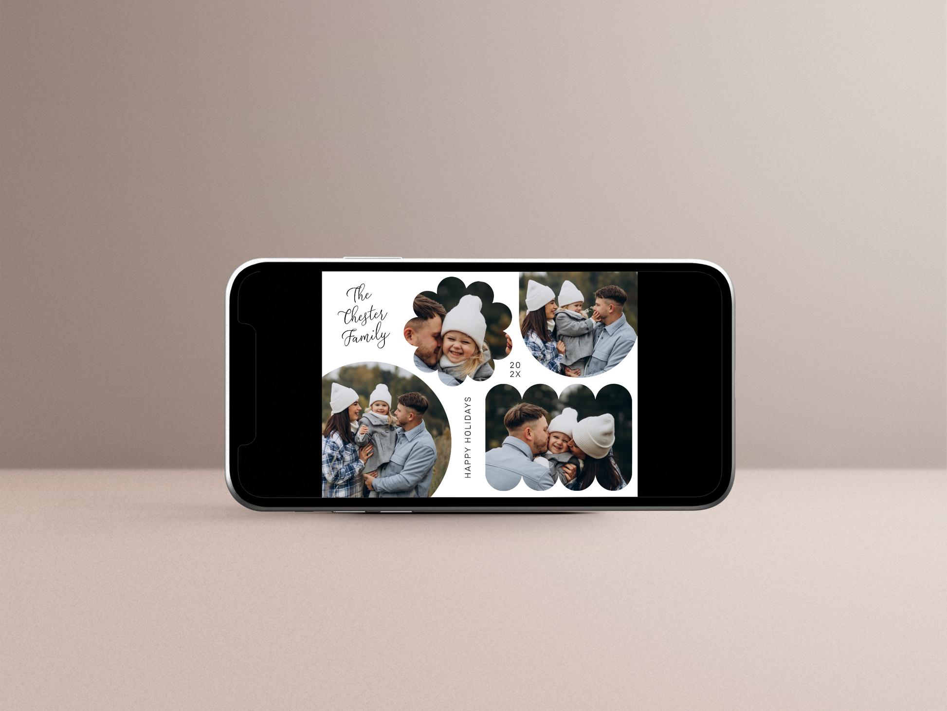 Share your holiday joy with our unique and modern Christmas photo card design! The front showcases four photos arranged in playful shapes, including a circle, an arch, a flower, and a wavy rectangle. A fun twist on a traditional holiday card design. Your family name is written in modern script in the top left corner, while “Happy Holidays” (or your own custom greeting) adds a quirky touch, rotated 90 degrees along the edge of the rectangle. The year is split across two lines, in the space between the shapes. The back has a full-size portrait on the back, alongside your custom Christmas message signed with love.