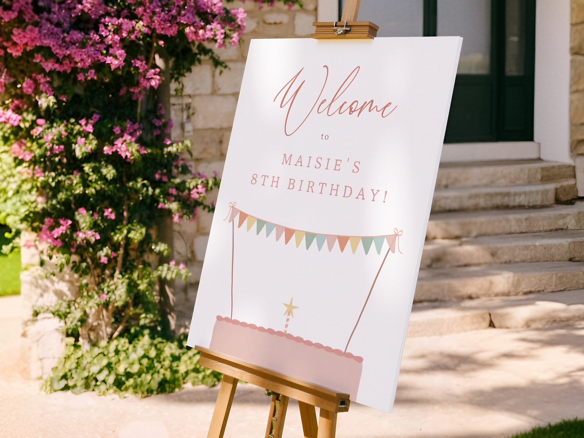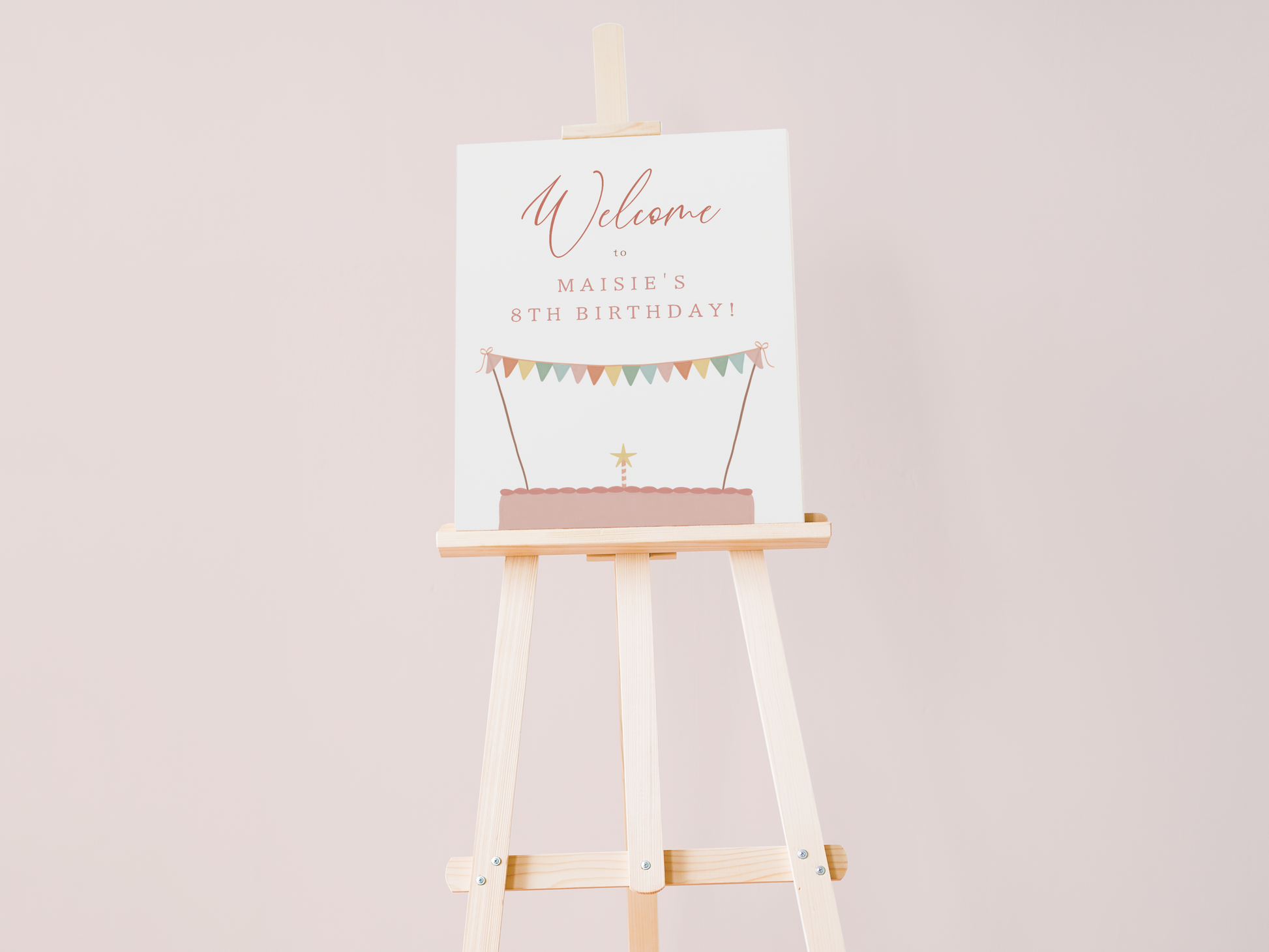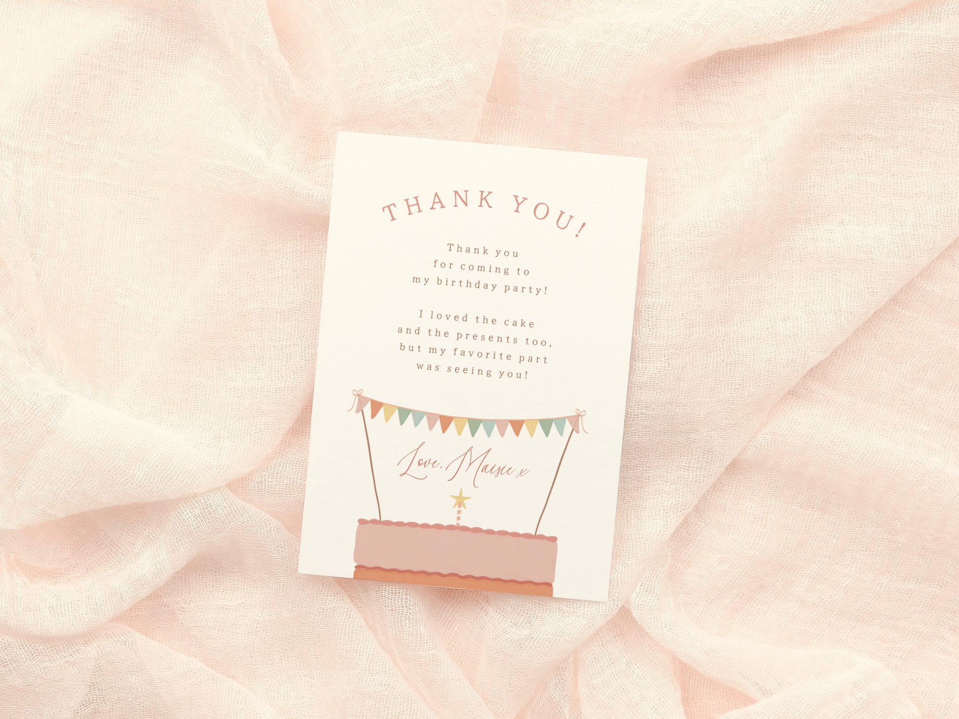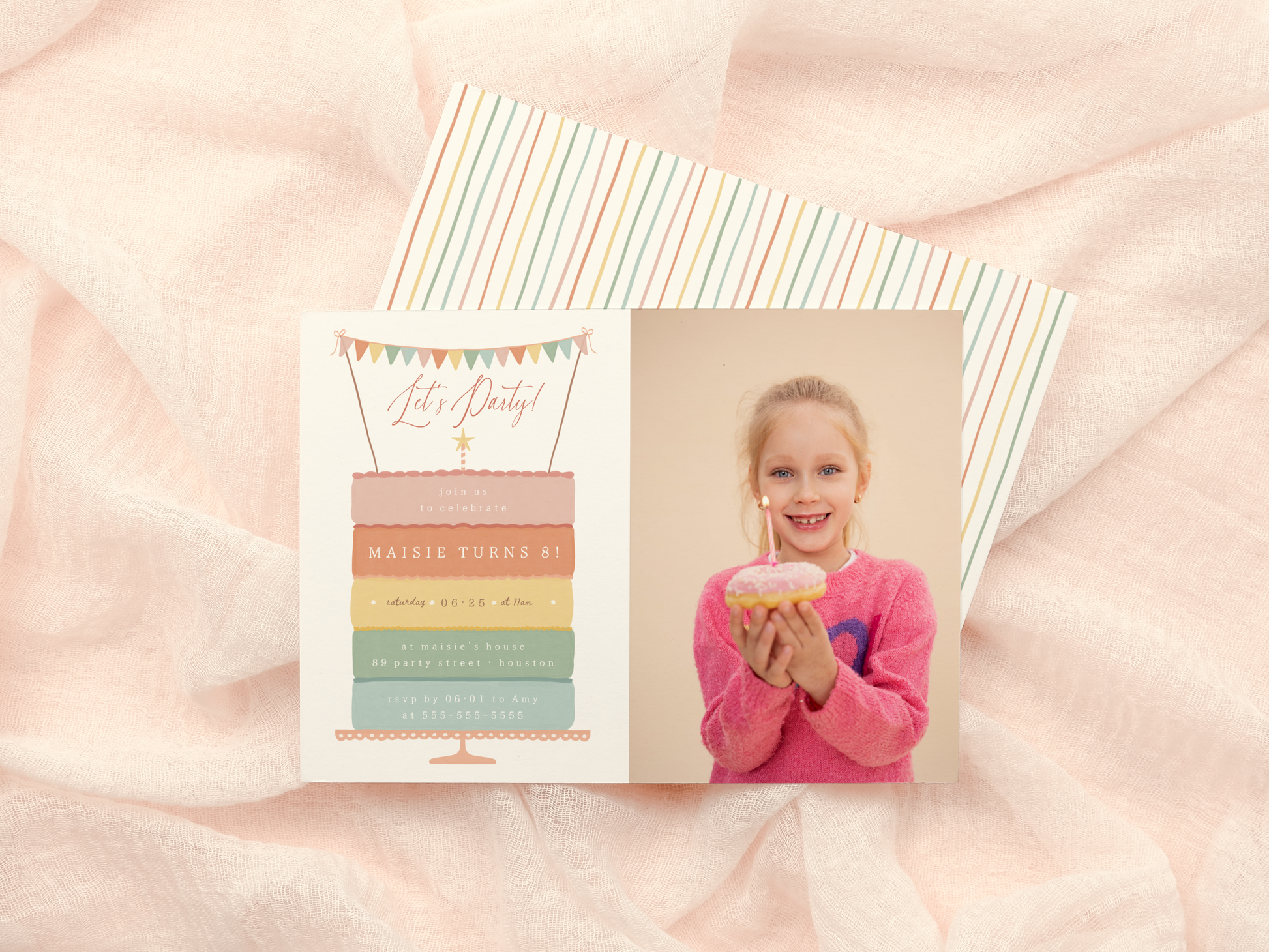 Get ready to party with this super cute birthday invitation featuring a hand-painted rainbow layer cake! The cake topper has pastel rainbow bunting and a star-topped candle, and the event details are written right on the colorful cake layers. The birthday girl’s name stands out in bold capitals, with tiny white flowers separating the event date. On the back, you’ll find cute rainbow stripes on a white background. This design can be used for any theme, as long as there is cake! Ideal for fairytale or princess costume parties, a unicorn theme, baking or art parties, or a magical garden party, this design is full of charm and fun. This sweet and whimsical invite is the perfect way to set the tone for an unforgettable celebration! Photo and non-photo versions to choose from.