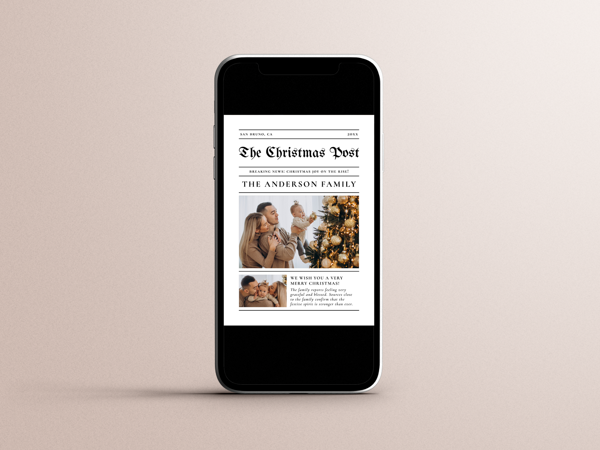 Read all about it! Turn your holiday card into a charming keepsake with this newspaper-style Christmas photo card design! The front features your city and year at the top, followed by “The Christmas Post” in a classic blackletter font. The headline reads “Breaking News: Christmas Joy on the Rise,” with your family name in bold capitals. Two photo spots are available, including space for a custom greeting. On the back, the “Year in Review” section highlights your family’s milestones with another photo, personal text, and four smaller captioned photos at the bottom.